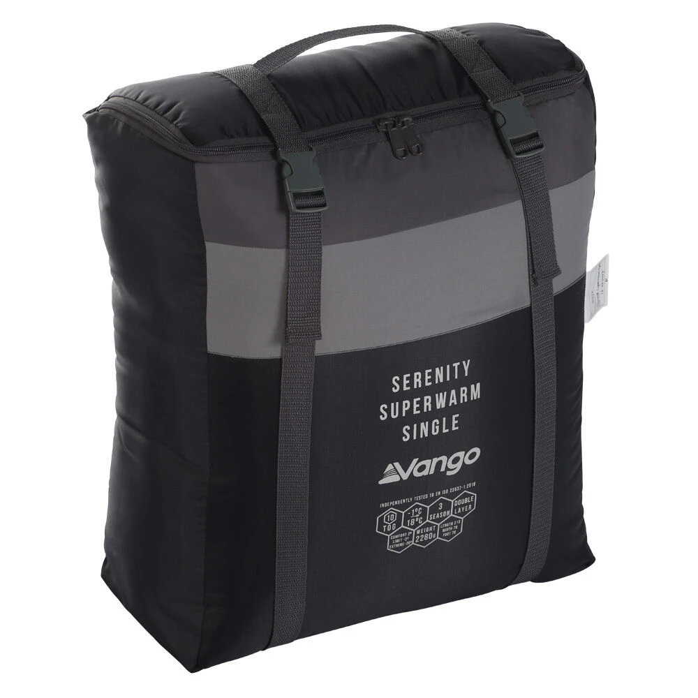 The Vango Serenity Superwarm Single provides a surprisingly low price on a three-season sleeping bag with good quality double-layer insulation. The bag features a square shape for extra leg space and an integrated headrest for extra comfort. A brushed polyester interior ensures a relatively warm feel. A raft of other features introduces plenty of quality Vango innovations to this bag to make it an excellent choice for a comfortable camping trip from spring through to autumn.